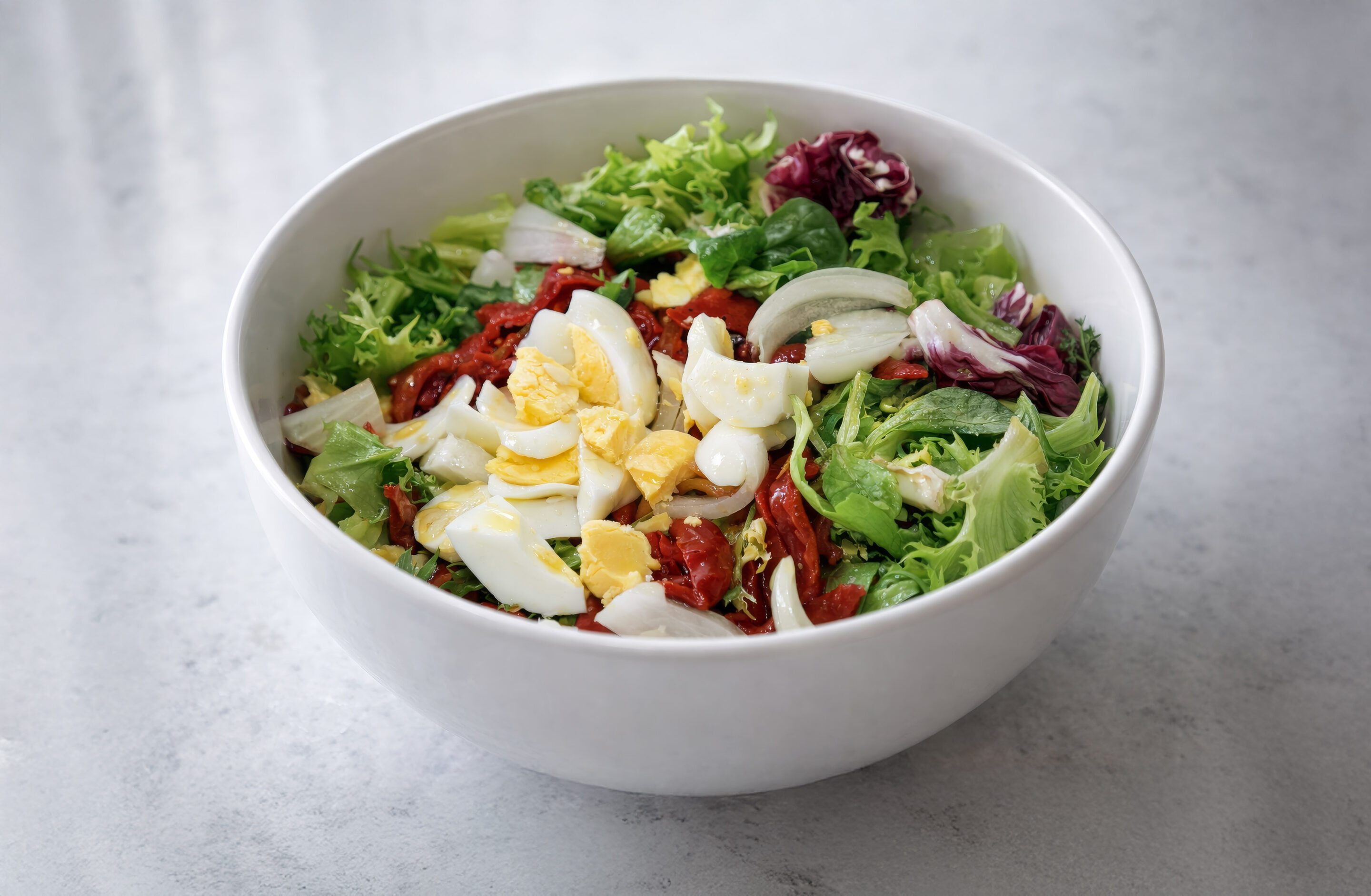 Incorpora la cebolla fresca cortada en juliana y el huevo cocido troceado. - Aliñar y servir